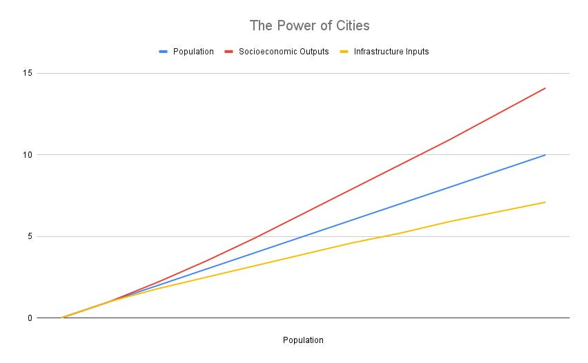 Human-created systems can also follow nature’s scaling laws, especially when they emerge organically. And what human-created systems emerge organically, you might ask? Our cities do. Our cities unconsciously arise and organize themselves like a living, breathing organism. This means that our cities scale favorably. Infrastructure, the length of roads, piping, electric lines, fiber optic cables, and even the number of gas stations, scales sublinearly with population size to the exponent of 0.85. This means the population grows faster than the total inputs required to support it. Socioeconomic output, on the other hand, such as the number of patents produced, GDP, and even average incomes, scales superlinearly to an exponent of 1.15. In other words, the larger the city, the more innovative and affluent it tends to be, making better use of human capital.