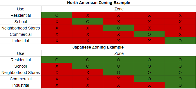 Another alternative approach can be found in Japan, where there are only 12 zone types, greatly simplifying administration compared to the hundreds of zoning variants and sub-variants found in the United States and other countries. The Japanese order these zones in terms of maximum potential “nuisance,” and like FBC, might be thought of as “inclusive” rather than “exclusive,” not limited to a single use. Uniquely, these zoning laws are standardized at the national level, with local governments’ power limited only to implementation. This is crucial because it prevents zoning boards and local governments from rigging the regulations to inflate their own property prices.