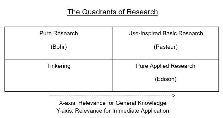 Most importantly, however, DARPA’s research is dedicated to Pasteur’s Quadrant. Typically, research funding is allocated by intent, with some directed to “applied science,” or research aimed solely at practical uses, and some going toward “basic science,” or the pure quest for fundamental understanding. However, as Donald Stokes opines in his book, Pasteur’s Quadrant, this is a misleading dichotomy. Rather than being opposed to one another, basic and applied science are orthogonal, and the bridge between them is Pasteur’s Quadrant. The quadrant is named after Louis Pasteur, a scientist who exemplified both the quest for knowledge and its practical applications.
