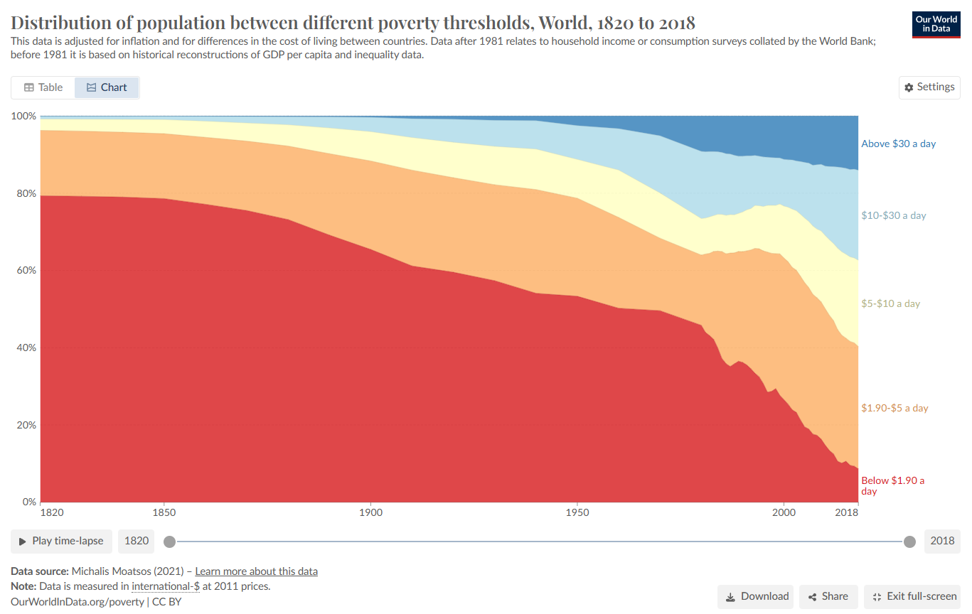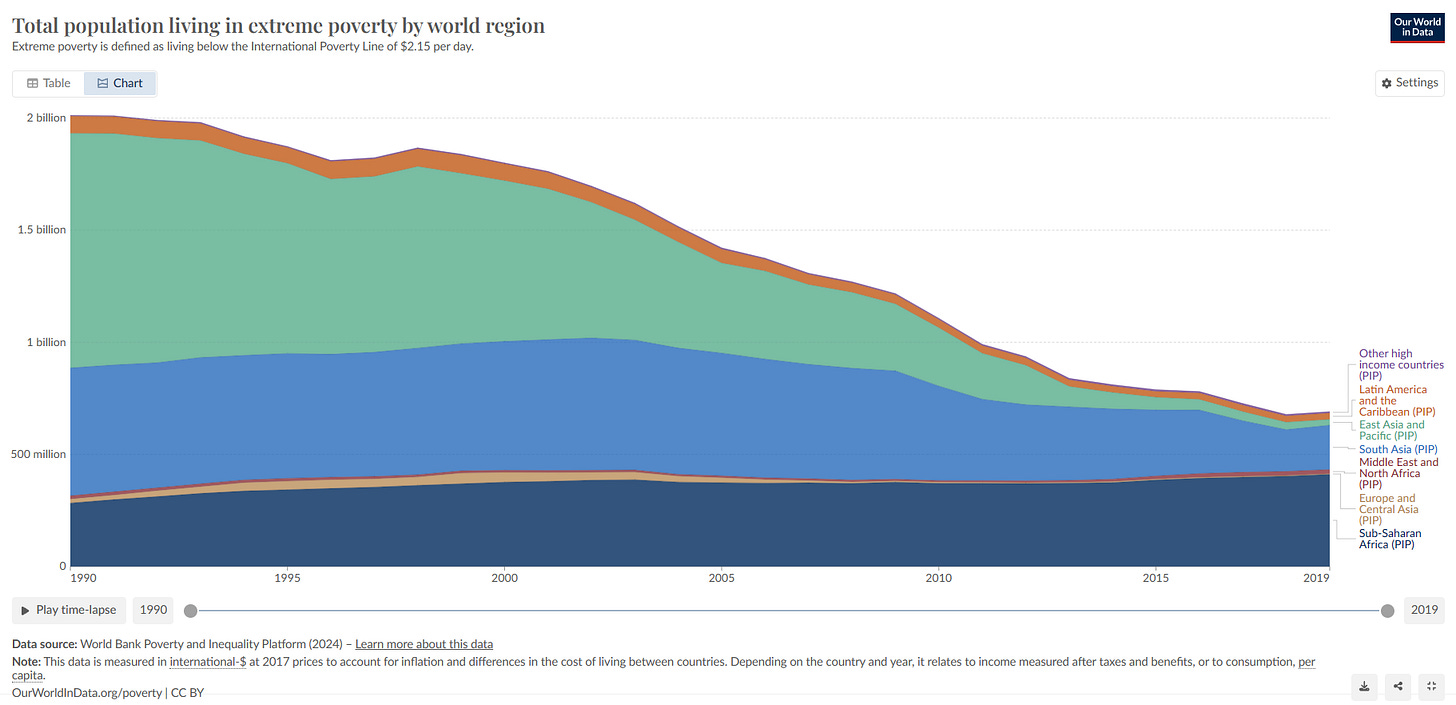 It’s not just the percentages that shrank either. The total number of people living in absolute poverty has shrunk as well from about 2 billion in 1990 to under 700 million in 2019. This is remarkable, even if much work remains to be done.