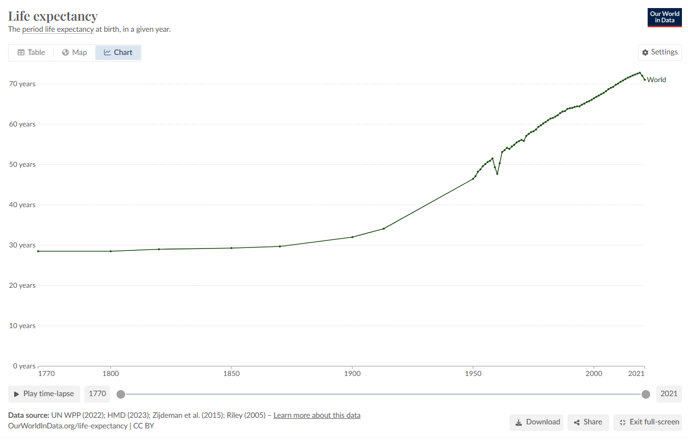 Since the Industrial Revolution, more of us can enjoy life. At the same time, incredible advances in medical technology have also allowed us to live much longer. Globally, the average life expectancy has risen dramatically from 29 years in 1820 to 72 years in 2020. In many wealthy nations, the average life expectancy is now over 80 years.