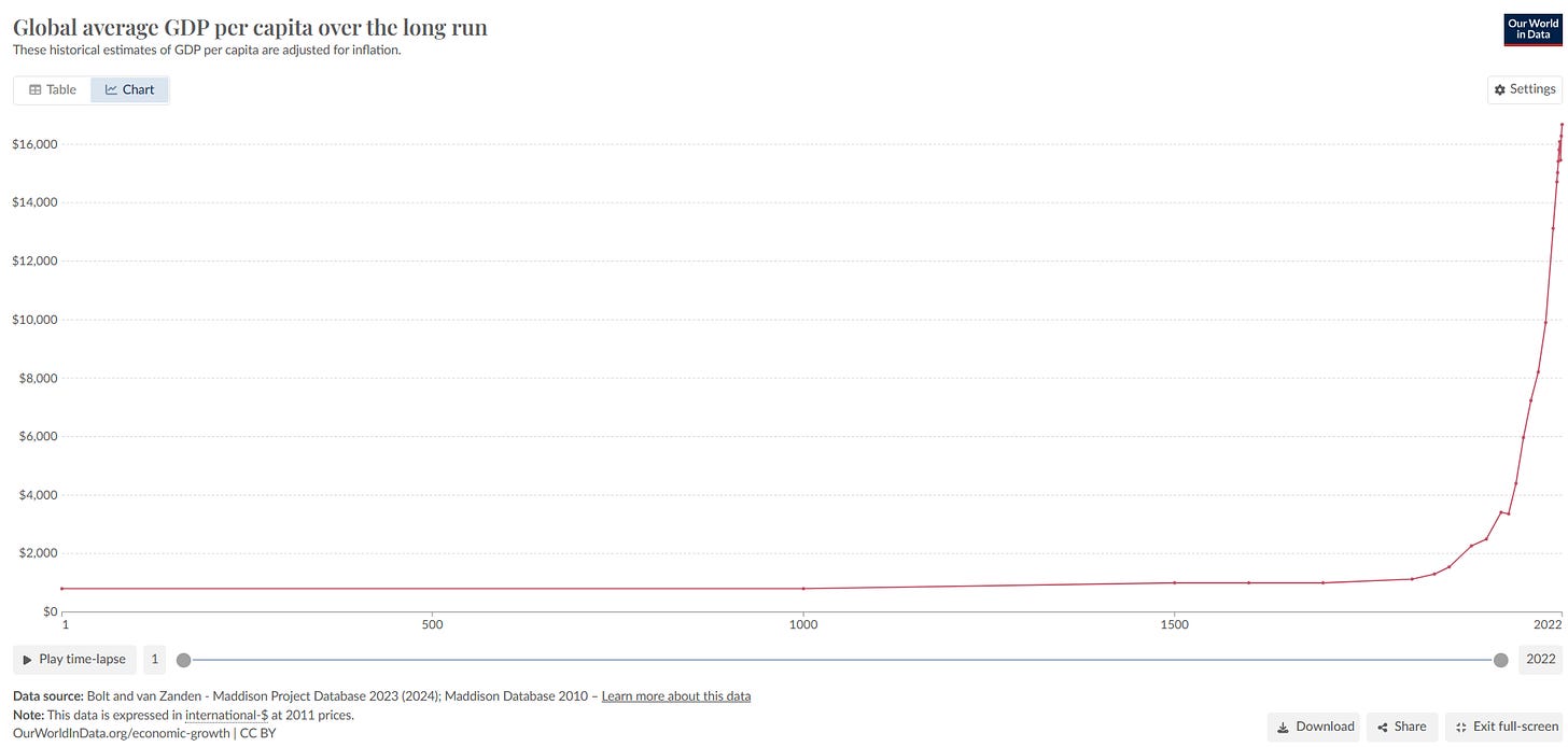 Material “wealth” is understandably controversial, but as we will discuss, wealth is merely another key performance indicator of human progress and the expansion of our knowledge base. Wealth brings us opportunity and individual capability. For most of our history, the vast majority of humanity was extremely poor, grinding away a subsistence existence, with just enough food to live and reproduce. Our “wealth” grew very slowly, beginning with the agricultural revolution, before again exploding during the Industrial Revolution after 1800.