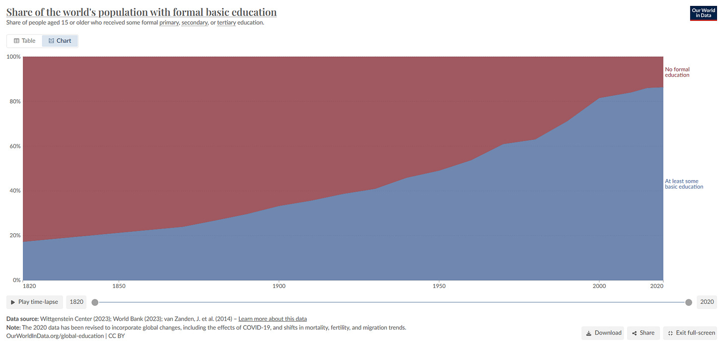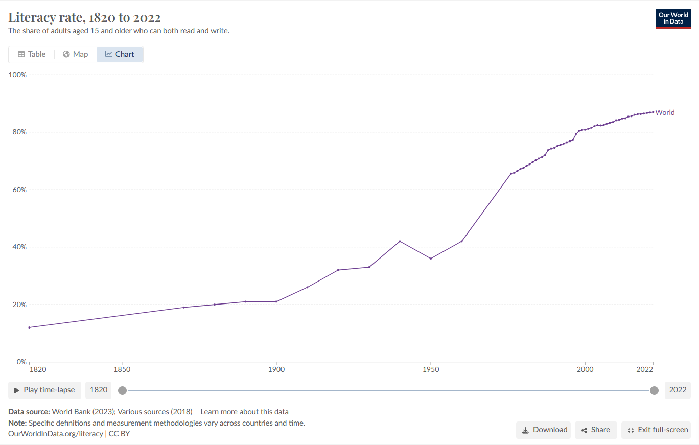 Let’s begin with literacy, as it is a key metric of human progress and individual potential. The ability to read and write unlocks the capability of learning from others through books and written works, and the accelerated dispersion of knowledge. Literacy was once a privilege reserved for an elite few. Yet, since the industrial era, we can see a literal inversion in illiteracy. Global literacy soared over the last two centuries, inverting the proportion of people who are literate and illiterate. In other words, humanity progressed from 12 percent literate in 1820 to 12 percent illiterate in 2020.