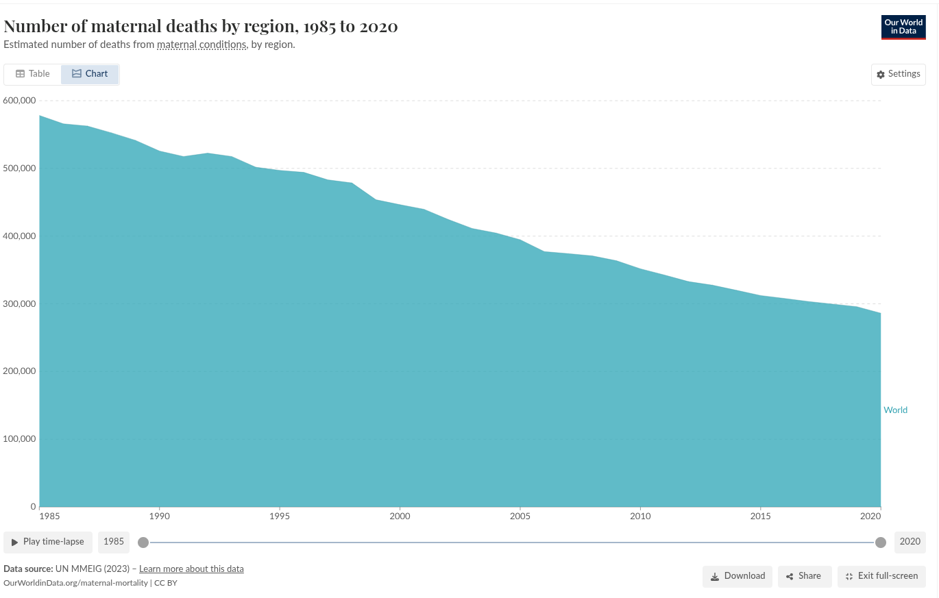 Maternal mortality, which measures the ratio of women who die within 42 days of giving birth (measured per 100,000 live births), has also been cut in half globally since 1985, when the first data became available.