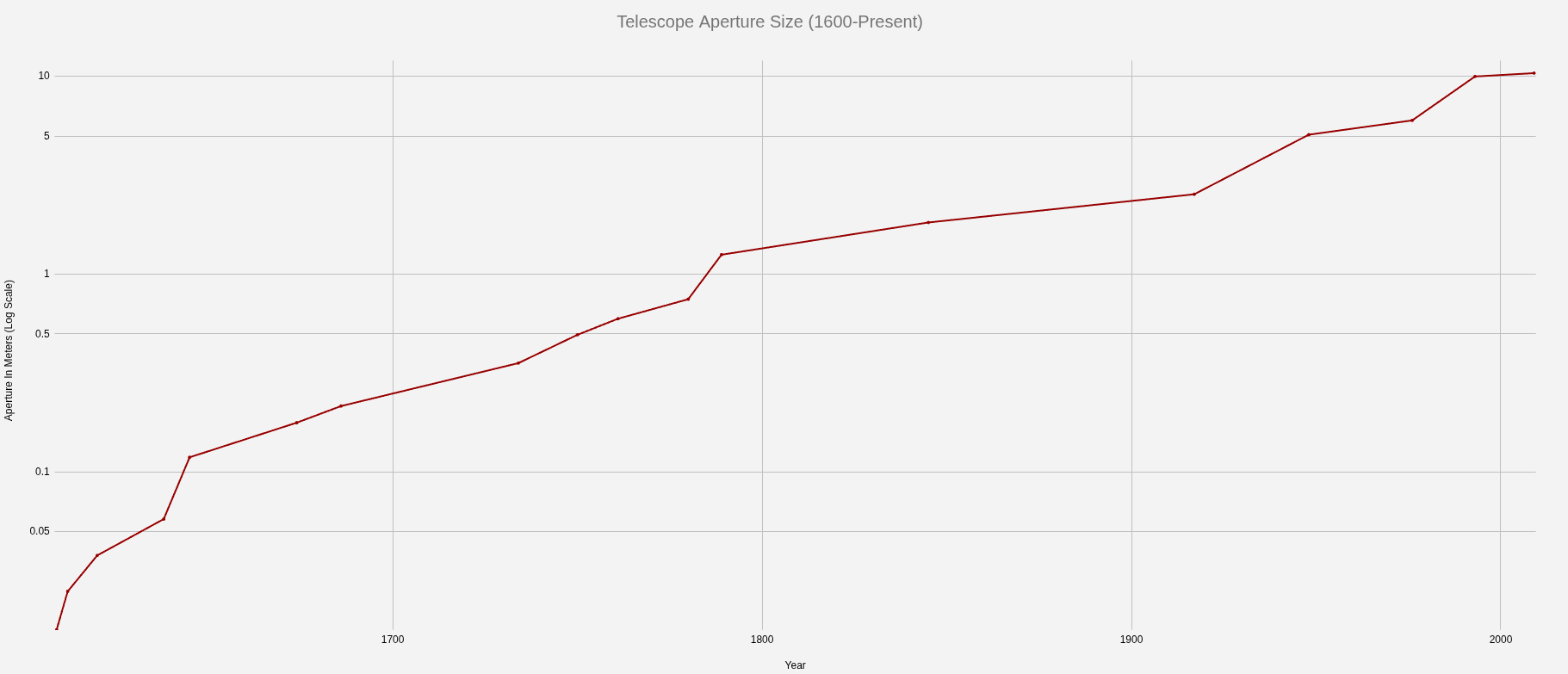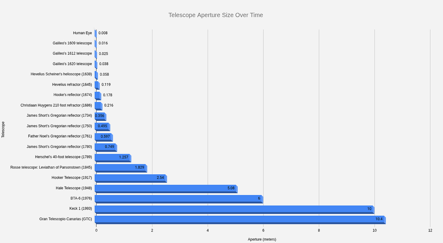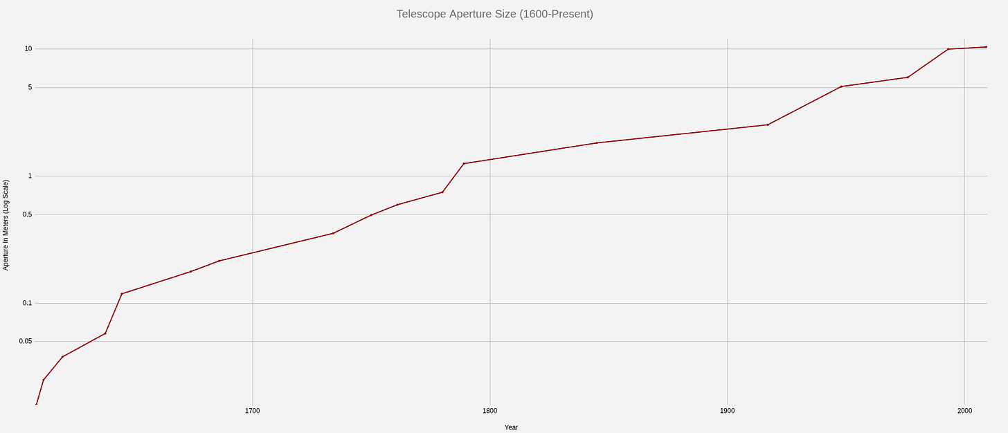Above is a visual representation of the maximum aperture diameter humans have achieved over time. Plotted on a log scale (below), we can see an interesting and notable trend. Since 1650, aperture sizes have roughly doubled every 50 years. This sounds impressive, but actually undersells the improvement rate in total light collection. In these charts, I am only looking at the relative diameter of the aperture, but diameter is not the proper metric; the total area of the aperture is. With every doubling of the aperture diameter, we quadruple the total light collection area, meaning that our telescopes have become about 4x more capable every 50 years.